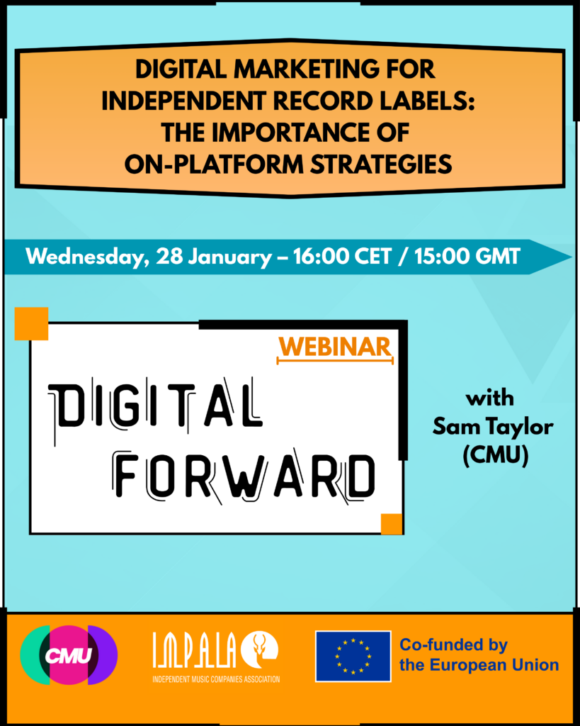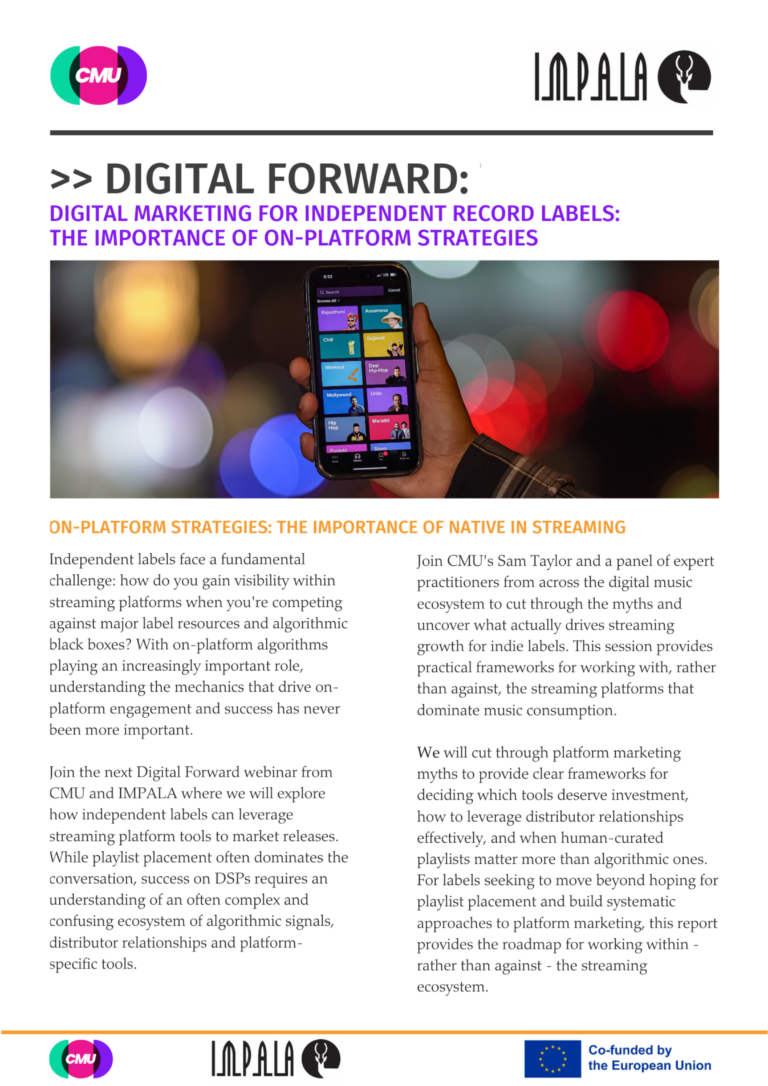 Join the next Digital Forward webinar (28th January – 16:00 CET) from CMU and IMPALA where we will explore how independent labels can leverage streaming platform tools to market releases. While playlist placement often dominates the conversation, success on DSPs requires an understanding of an often complex and confusing ecosystem of algorithmic signals, distributor relationships and platform-specific tools. This forms the second part of our three-part guidance on Digital Marketing.