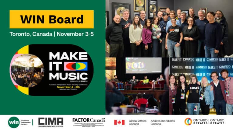 The WIN board and secretariat travelled to Toronto from November 3-5 to hold an in-person meeting and take part in a series of activities hosted around Make It Music and the celebration of CIMA’s 50th anniversary. Through meetings, panels, and networking events, the trip reinforced the strong ties between WIN and the Canadian independent music community, while highlighting shared priorities across music markets.